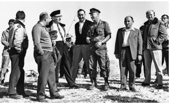 Thủ tướng Eshkol (thứ tư từ trái qua, đội mũ đen, thắt cà vạt), xếp Mossad Amit (ở giữa, đang cười) và cựu giám đốc Mossad Harel (thứ ba từ bên phải).