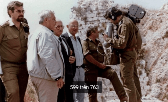 Thủ tướng Menachem Begin (thứ ba từ trái qua), Bộ trưởng Quốc phòng Sharon (thứ hai từ trái qua), và tùy viên quân sự của thủ tướng, Chuẩn tướng Azriel Nevo (trái) đang thị sát một vị trí của PLO ở nam Lebanon sau khi bị Israel chiếm được vào tháng 6.