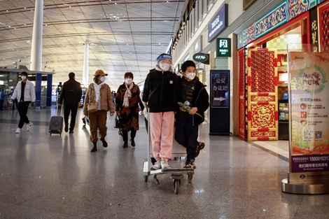 Hành khách đeo khẩu trang đi bộ qua Sân bay Quốc tế Thủ đô Bắc Kinh tháng trước. Ảnh: EPA-EFE