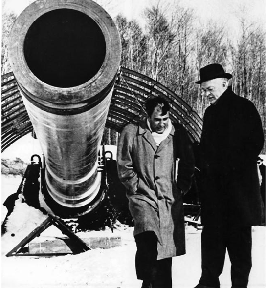 Tiến sĩ Gerald Bull (trái) thanh tra một siêu đại bác mà mình chế tạo cùng với cựu thủ tướng Quebec, Jean Lesage (phải).