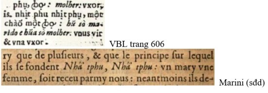 Như đã viết bên trên, một trong 7 bí tích là phép hôn nhân hay phép “một vợ một chồng”, LM de Rhodes đã phải ghi dạng HV tương đương là “nhịt (nhất) phu nhịt (nhất) phụ” (mục phụ, VBL trang 606 – hình chụp bên dưới) để dễ ‘tiếp cận’ với quan chức đương thời (thường có học/rành chữ Nho). LM de Rhodes nhắc lại bí tích này trong PGTN trang 299 “khi chẳng phải việc ngay trong một vợ một chồng … Mà sự giao cảm cho ngay, thì phải có một vợ một chồng”. Ngay cả các giáo sĩ Dòng Tên đàn anh của De Rhodes như Matteo Ricci hoàn toàn không chấp nhận chế độ đa thê ở Trung Quốc, dù đã cố gắng dung hoà tư tưởng Khổng giáo với giáo lý CG. Do đó, vấn đề hôn nhân theo CG và chế độ đa thê trở thành một bức rào cản rất khó vượt qua và cũng trở thành một nguyên nhân dẫn đến việc cấm đạo – nhất là khi từ vua đến quan và dân đen đều có thể thực hành chế độ đa thê đa thiếp (được luật pháp cho phép như luật Hồng Đức chẳng hạn). Không những chỉ có LM de Rhodes dùng “nhất phu nhất phụ”, LM Marini cũng dùng thành ngữ HV này trong tác phẩm của ông để nhắc nhở giáo dân bí tích quan trọng này trong CG – xem các hình chụp bên dưới: