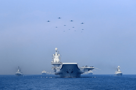 Tàu sân bay Liêu Ninh Trung Quốc trong một cuộc tập trận hải quân tổ chức ở Biển Đông tháng Tư 2018. Ảnh: Weibo qua VCG