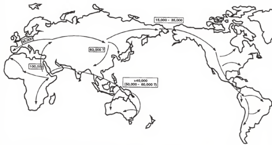 Bài 1 có nói qua giả thiết OOA; ở đây, cho tôi thêm rằng Cavalli-Sforza (1922–2018), nhà ‘di truyền học’ (geneticist) nổi tiếng người Ý ở Mỹ, cách nay gần 30 năm, dựa theo dữ liệu ‘gene’ của con người, đã nêu giả thiết rằng ‘người thời nay’ (anatomically modern human, viết tắt ‘AMH’) từ 100 ngàn năm trước (viết tắt ‘100 kya’) đã rời châu Phi đi ra ở khắp nơi trên thế giới theo lộ trình và thời gian đại khái như hình 1.