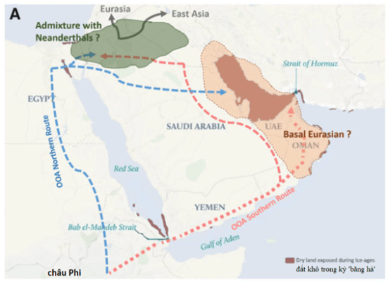 Nhích thêm một bước, Ferreira et al[3] (2021) cho rằng có hai nhóm AMH từ bên trong châu Phi đi ra ngoài theo hai hướng. Sau khi ra ngoài châu Phi thì hai nhóm AMH dừng lại hai nơi trên bán đảo Arabia với hai diễn biến như sau.