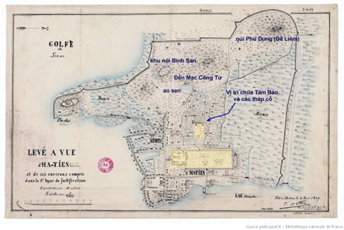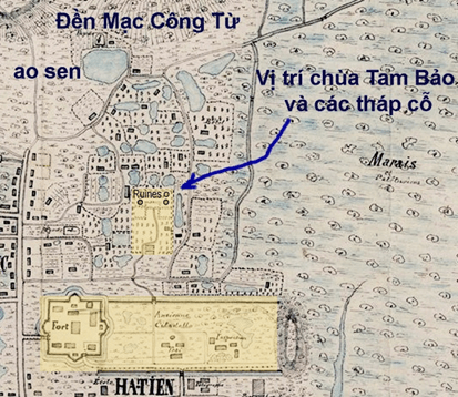 Bản đồ do người Pháp vẻ tay vào năm 1869 khu vực Hà Tiên. Ô vuông đứng màu vàng phía trên là khu phế tích dinh thự thành quách của Mạc Cửu, trong đó có ghi rỏ vị trí chùa Tam Bảo đầu tiên và ba hình tròn nhỏ xem như ba bảo tháp còn lại. Khu ô chữ nhật màu vàng phía dưới là khu thành cũ của Mạc Thiên Tích xây dựng.