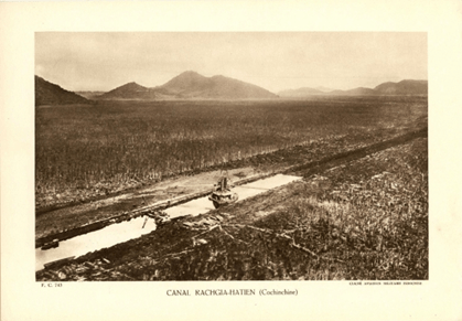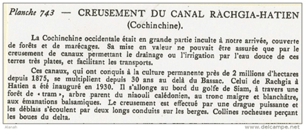 Phần bản văn giải thích về tấm hình chụp kênh đào Rạch Giá-Hà Tiên phía trên: Phần lớn miền tây Đông Dương trước khi chúng tôi đến không canh tác gì được. Sự phát triển của vùng nầy chỉ có thể bảo đảm bằng cách đào kênh cho phép tháo nước và tưới nước ngọt những khu đất bằng nầy, đồng thời tạo điều kiện tốt cho sự vận chuyển. Những con kênh đào nầy đã chinh phục được sự canh tác thường xuyên gần 2 triệu ha kể từ năm 1875, được tăng thêm từ 30 năm nay ra khỏi khu sông Hậu Giang. Con kênh đào Rạch Giá-Hà Tiên được khánh thành vào năm 1930, kênh nằm dọc theo vịnh Xiêm La, xuyên qua một khu rừng cây tràm (cây thuộc nhóm « niaouli calédonien »), với thân cây ốm và có màu trắng đục. Công việc đào kênh được thực hiện bằng tàu nạo vét mạnh và phần đất nạo vét được thải qua hai ống dài dẫn lên hai bên bờ kênh. Trong hình ta còn thấy những ngọn đồi đá nhô lên từ vùng bùn lầy của đồng bằng.