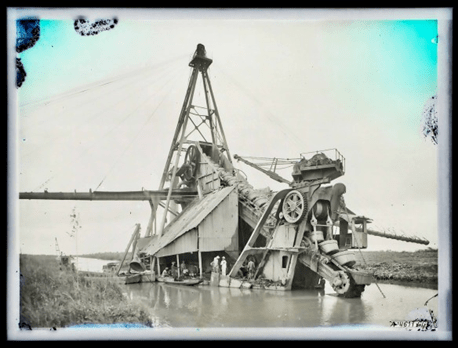 Tàu xáng vét đang hoạt động trên kênh Rạch Giá, (1920 – 1929). Nguồn hình: Trang face Book « Thú Chơi sách ».