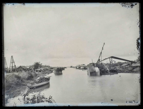 Rạch Giá 1920-1929 – Đào kênh. Tàu xáng « hai » đang hoạt động trên đoạn kênh lơn nối Rạch Giá-Long Xuyên. Nguồn hình: Trang face Book « Thú Chơi sách ».