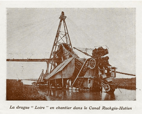 Rạch Giá 1920-1929 – Vét kênh lớn. Tàu xáng « Loire » đang nạo vét đoạn cuối kênh lớn nối trung tâm Rạch Giá và Hà Tiên … (đoạn đầu đã được tàu xáng « Hai » thực hiện). Nguồn hình: Trang face Book « Thú Chơi sách ».