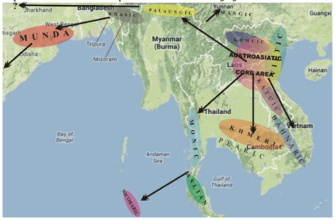 - Từ đây họ lan ra khắp vùng Đông Nam Á – Ấn Độ và về sau tạo nên những đám thổ dân O-M95 nói tiếng Austroasiatic trong vùng.