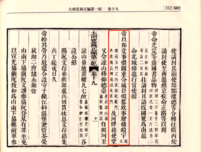 “Vua cho sự thể bang giao là một việc quan trọng, hạ lệnh cho quan Bắc Thành noi theo việc cũ của triều Lê, xây thêm điện vũ (Đặt điện Cần chánh ở bên trong năm cửa trước điện Kính Thiên, ngoài cửa điện Cần chánh dựng một cái rạp dài, đằng trước đặt cửa Chu Tước) và nhà tiếp sứ ở bên sông”. (H 6)