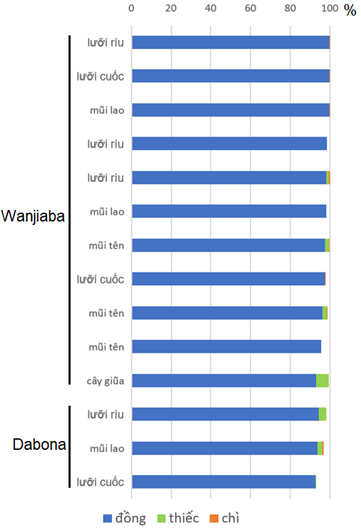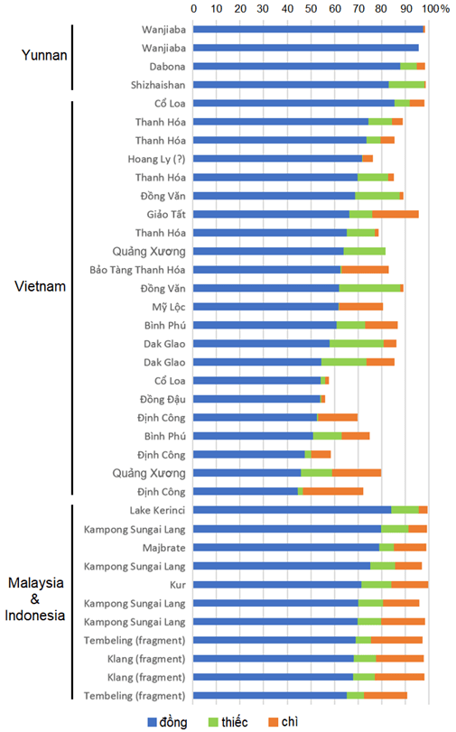 Hình 2 cho biết thành phần kim loại trong thứ vật liệu dùng để đúc trống ở Yunnan (Vân Nam), Việt Nam và Malaysia-Indonesia (Hollman et al[4]).