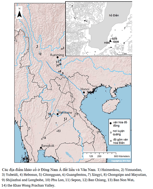 Hình 4 cho thấy những địa điểm có di tích luyện quặng đồng ở Yunnan và Đông Nam Á.