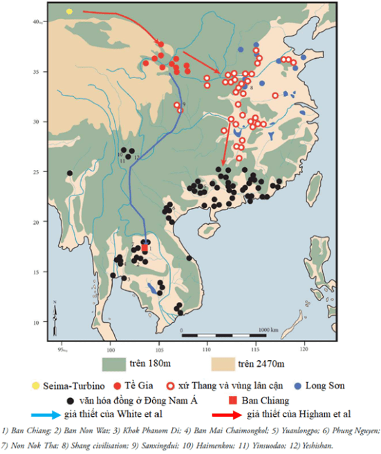 ‘Seima-Turbino phenomenon’ là tên gọi chung những hiện vật làm bằng đồng-pha-thiếc chôn theo người chết ở hai nghĩa địa Seima và Turbino trên miệt Bắc Á, có ‘date’ 2150–1600 BCE chưa kể sai số.[10] Higham et al[11] phân tách dữ liệu ở nhiều địa điểm và cho rằng nghề luyện đồng lan từ Bắc Á sang bắc Đông Á rồi từ đây mới lan xuống nam Đông Á và Đông Nam Á (hình 8).