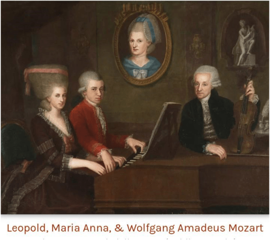 Wolfgang là một thần đồng, và cậu đã học cả dương cầm và sáng tác từ lúc năm tuổi. Người chị của Wolfgang sống sót qua thời kỳ ấu thơ là Maria Anna (biệt danh ‘Nannerl’, 1751-1829), cũng là một nghệ sĩ dương cầm tài năng.  Maria Anna, là một phụ nữ và là nạn nhân của những hạn chế xã hội trong thời kỳ đó, buộc phải từ bỏ mọi ước mơ được biểu diễn trước công chúng.  Trong khi đó, Wolfgang tiếp tục mê hoặc công chúng với tài năng thiên bẩm của mình, khiến khán giả thán phục không chỉ bằng cách chơi đàn mà còn bằng những ‘kỹ xảo như ứng tấu, chơi trực tiếp từ một bản nhạc được ký âm chưa đọc trước mà không phạm lỗi, chơi với bàn phím được phủ bằng vải và ký âm hoàn hảo khi nghe bài nhạc mới chơi lần đầu tiên.