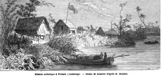 Hội truyền giáo tại Pinhalu, Campuchia (Sabatier vẽ theo ghi chép của Mouhot). Nguồn: Tour du Monde, 2e semestre 1863.