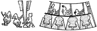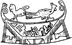 Hình người chèo ghe trên thân trống (hình 10), theo Ratta, có lẽ là để đưa hồn người chết đi sang cõi khác; dù vậy, theo thiển ý, hình này có lẽ là những hồn ma trở về cõi của họ sau khi tới chia vui với người sống trong lễ bỏ mả và đem theo quà, từ trái qua phải, là chó, trống và con nít!