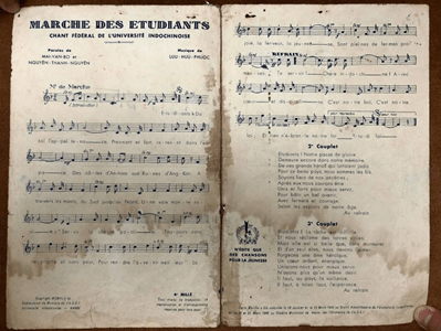 Bài “Marche des étudiants” (Sinh viên hành khúc) – Bài ca của Đại học Đông Dương. Nhạc: Lưu Hữu Phước. Lời: Mai Văn Bộ, Nguyễn Thành Nguyên (bản in đầu, 1942).