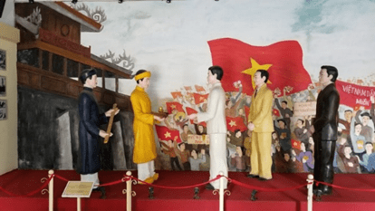 Bảo tàng Lịch sử Thừa Thiên – Huế tái hiện vua Bảo Đại trao ấn và kiếm cho đại diện Chính phủ CMLT VNDCCH tại lễ thoái vị ngày 30-8-1945. Nguồn: VOV