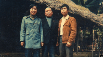 Bộ trưởng Cù Huy Cận và vợ chồng con trai, Tiến sĩ Cù Huy Hà Vũ – Luật sư Nguyễn Thị Dương Hà, trước căn nhà nơi ông sinh ra tại Ân Phú, Hà Tĩnh – 1983. Nguồn: Cù Huy Hà Vũ
