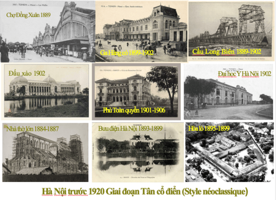 Trước năm 1920, bộ mặt kiến trúc mang phong cách Tân cổ điển châu Âu. Trong giai đoạn đầu, từ cuối thế kỷ XIX đến trước năm 1920, đặc biệt từ khi P. Doumer đến Hà Nội (1897-1902), cùng với những nhà tư bản Pháp đến nhiều hơn, người Pháp đã xây dựng một loạt các công trình lớn tại Hà Nội: Chợ Đồng Xuân (năm 1889); Nhà thờ lớn (1884-1888); Cầu Long Biên (1889-1902); Bưu điện Hà Nội (1893-1899); Bốt nước Hàng Đậu (năm 1894); Nhà tù Hỏa lò (1895-1899, 1898-1901); Ga Hàng Cỏ (1899-1902); Khách sạn Metropole (năm 1901); Nhà Godard Tràng Tiền (năm 1901); Phủ Thống sứ (1900-1906, 1909-1918, nhà khách chính phủ ngày nay); Nhà hát lớn (1901-1911); Ngân hàng Hà Nội 1918-1831, Viện Viễn Đông bác Cổ  (với nhiều lần xây dựng mà bắt đầu từ 1905. Thư viện KHXH ngày nay)… [10].