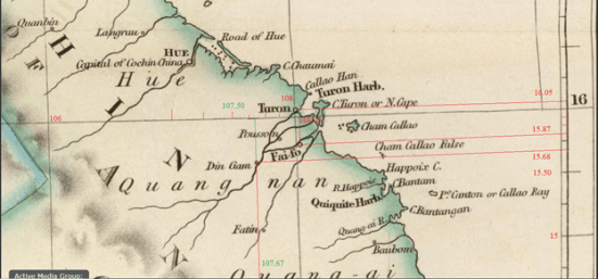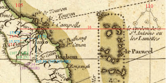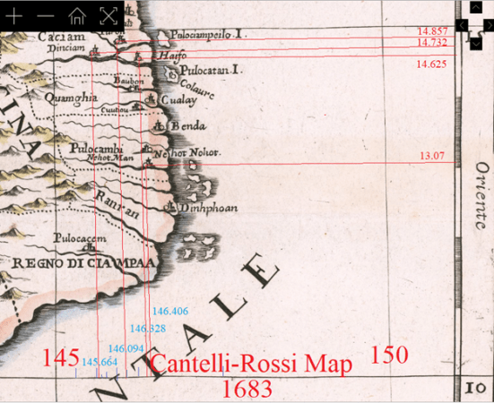 Trong lúc lựa chọn các bản đồ cổ, ngoại trừ tấm bản đồ cổ do Cantelli-Rossi vẽ năm 1683 – chúng tôi lựa chọn nó vì nó có vẻ chính xác và tương đối có nhiều chi tiết về địa hình của Hội An và Dinh Chiêm, chúng tôi sẽ loại bỏ các bản đồ cổ xưa hơn trong thế kỷ 16, 17 và 18. Lý do là vì cho đến đầu thế kỷ 19, các nước như Anh và Pháp mới sở hữu những phương thức tính toán kinh độ một cách chính xác trên hàng hải. Cho mãi đến năm 1884, cả thế giới mới công nhận đường kinh tuyến chính 0º chạy dài qua thành phố Greenwich, Anh Quốc là tiêu chuẩn quốc tế. Vì thế, trong một số bản đồ cổ, chúng tôi phải thay đổi hệ thống kinh tuyến của các quốc gia khác sang vị trí tại Greenwich.