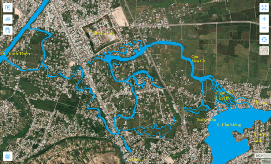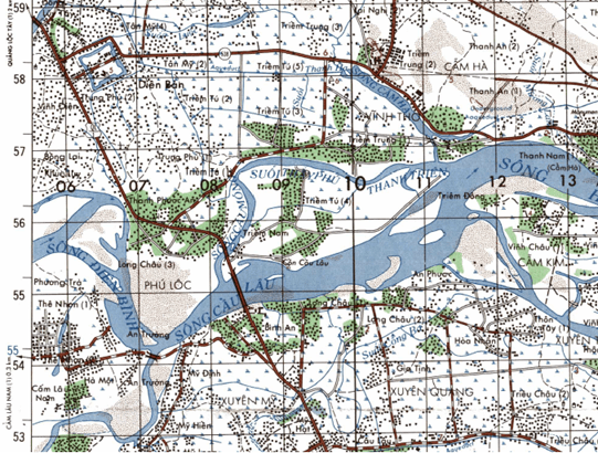[147] Cái tên “Cầu Mống” được trích ra từ bản đồ quân sự Hoa Ky vẽ vào năm 1972-1984. Nguồn: US Army, University of Texas, Austin. Trong bản đồ quân sự này, quân đội Hoa Kỳ gọi con sông này là Câu Móng; có lẽ họ bỏ thiếu dấu. Hãy xem Hình 24.