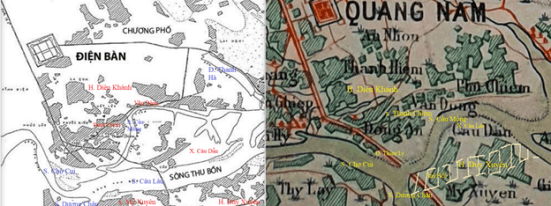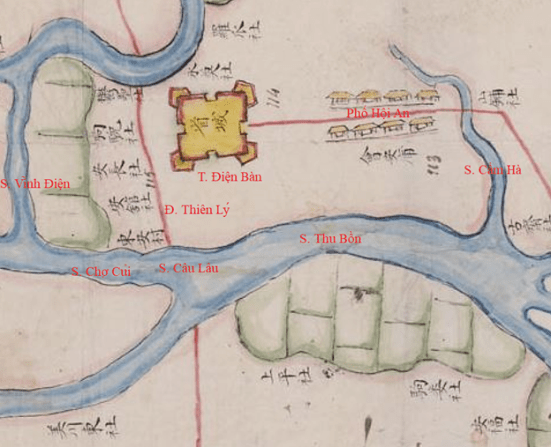Ngoài Đại Nam Nhất Thống Chí, để đưa ra những nhận xét và kết luận xác đáng, chúng tôi sẽ cần rất nhiều tài liệu lịch sử khác như Hoàng Việt Nhất Thống Dư Địa Chí (1806) do Lê Quang Định viểt; Phủ Biên Tạp Lục (1776) và Kiến Văn Tiểu Lục Toàn Tập do Lê Quí Đôn viết và cả Đại Nam Thực Lục (1821-1909). Sau đó, chúng tôi sẽ sưu tầm trong mạng hầu hết các bản đồ cổ liên quan đến Hội An; chúng tôi sẽ chú tâm nhất vào vùng nam Điện Bàn và các phụ cận về hướng nam của nó vì vùng đất này, nói chung là dinh đô của Trấn Quảng Nam – Dinh đô này bắt đầu vào năm 1602, khi Chúa Nguyễn Hoàng ghé qua Cần Húc và rất hứng thú với phong cảnh nơi đây. Dựa theo ngày tháng, chúng tôi sẽ bắt đầu bằng với Tranh cổ Chaya hiện đang cất giữ tại Chùa Jomyo-ji được vẽ rất tỉ mỉ khoảng năm 1640[45] do một thương nhân Nhật từng sống nhiều năm tại Hội An –hãy xem Hình 19. Sau đó, chúng tôi sẽ sưu tầm tấm bản đồ cổ điễn Đại Việt Thiên Nam Chí Lộ Đồ Thư (1686). Đây là một tấm địa đồ cổ nhất trong lịch sử Đại Việt – hãy xem Hình 12; tấm bản đồ người Anh có tựa đề Plan of Touron Harbour do Capt. Arthur Gore và Philip Bromfield vẽ (1764) – hãy xem Hình 26;  tấm Giáp Ngọ Nguyên Bình Nam Đồ (1774) trong Hồng Đức Bản Đồ – hãy xem Hình 18[46]; tấm bản đồ nhỏ từ đời vua Đồng Khánh (1886-1888) –hãy xem Hình 23; sau đó là tấm bản đồ khá quan trọng đối với chúng tôi. Trong khoảng thời gian 1907-1916, chính quyền Pháp Thuộc bận rộn xây cất một đường xe lửa nối liền hai thành phố Đà Nẵng và Hội An. Điều mà chúng tôi cảm thấy lí thú về tấm bản đồ này (Hình 7) là nó cung cấp rất đầy đủ tên các làng, xã, huyện của các vùng chung quanh Hội An, kể cả Điện Bàn,Vĩnh Điện, v.v… Quan trọng hơn nữa là bản đồ này cho thấy vị trị của xã Văn Đông (chính là xã Cần Húc ngày xưa) nằm bên bờ bắc (tả ngạn) sông Cầu Mống – Tên con sông Cầu Mống được trích ra từ bản đồ quân sự Hoa Ky vẽ vào năm 1972-1984 (Hình 24); tiếp sau đó là hai tấm địa đồ vùng Điện Bàn được giới thiệu trong luận án Tiến Sĩ của Huỳnh Thị Bảo Châu (2012) cũng rất quan trọng đối với công việc nghiên cứu chúng tôi về địa lý và địa hình của vùng nam Điện Bàn trong đầu thế kỷ 17 và 20 – Hình 9 và 27. Rất tiếc, tấm bản đồ thuộc địa này cũng cho thấy vào năm 1930, thành Dinh Chiêm cổ xưa đã bị san bằng. Để hiểu rõ những thay đổi và tiến triển trong một gian ngắn về địa hình tại miền nam Điện Bàn, chúng tôi kết hợp hai Hình 7 và 27 vào với nhau trong Hình 28. Đồng thời, trong vòng 23 năm (1907-1930) đã có sự tiến triển vượt bực trong giao thông toàn quốc, nói chung, và nam Điện Bàn, nói riêng, dưới thời Pháp thuộc. Con đường đất mòn Thiên Lý[47] nằm bên bờ tường Dinh Chiêm cũ đã được thay thế bằng Quốc Lộ (QL) Số 1 chạy xuyên qua giữa nội thành Dinh Chiêm, khiến thành Dinh Chiêm hầu như bị phá hủy và không còn nguyên vóc dáng như xưa nữa. Tuy nhiên, thế vào đó, chính quyền Pháp đã xây dựng “Dinh ấp Thanh Chiêm” cho xã Thanh Chiêm. Điều này nói lên tầm mức quan trọng của Thanh Chiêm vào thời ấy. Khi góp nhặt chi tiết từ hai tấm bản đồ 1907 và 1930, chúng ta có thể mường tượng ra vóc dáng đồ sộ của thành Dinh Chiêm thuở nào. Từ hai tấm bản đồ này, chúng tôi nghĩ chúng tôi có thể vẽ lại sơ đồ của nội thành Dinh Chiêm cùng với vị trí của nó so với Đường Thiên Lý ngày xưa (trước khi chính quyền Pháp Thuộc xây cất Quốc Lộ Số 1).