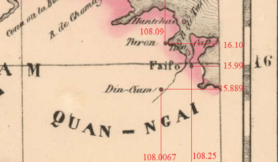 Trên mỗi bản đồ, nếu có thể được, chúng tôi sẽ dùng nhãn quang để đọc tọa độ của ba thành phố: Đà Nẳng, Hội An và Dinh Chiêm – tuy vẫn biết rằng cách đo đạc tọa độ từ các bản đồ cũ, đôi khi rách nát, hay nhăn nheo có thể sẽ đưa đến những địa điểm thiếu chính xác, nhưng chúng tôi vẫn phải cố gắng tận sức mình. Sau đó, chúng tôi sẽ tính khoảng cách chim bay giữa Hội An và Dinh Chiêm để xem nó có chính xác hay không khi so sánh với con số 8-9 km trong các tài liệu lịch sử. Một điều quan trọng nữa là chúng tôi muốn biết vị trí tương cận của hai thành phố này, đó là chúng nằm cùng một bên phải (hữu ngạn) hay trái (tả ngạn) bên bờ sông Thu Bồn.