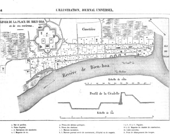 ‘Khi quan thủy sư làm chủ được từ huyện đó cho tới sông Đồng Nai rồi, người liền sắp đặt cách thế mà độ binh qua mé tả; chính vì người có ngồi tàu Ondine mà đi với một chiếc canonnière (thuộc chúa tàu Jonnart cai) đặng đến trước thành Biên Hòa, thành này bị cây cối án khuất, thấy đặng có một mình cột cờ mà thôi. Hai chiếc tàu bắn ba hiệp sung lớn mà không bị thệt hại chi, song khi chiếc canonnière đối xạ phát thứ ba thì bên An- nam ngưng bắn; rồi thấy một vầng lửa lớn cháy đỏ hực lên trên thành…’ (ĐNQLS…, sđd, tr. 383).