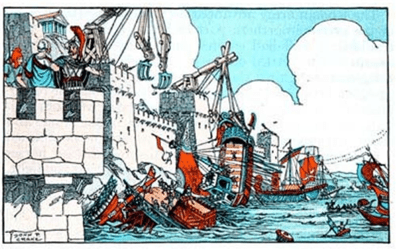 Nhiều câu chuyện đầy màu sắc vể Archimedes đã được các sử gia La Mã thuật lại. Chẳng hạn chuyện ông chế tạo những cỗ máy giúp phòng thủ thành Syracuse trong hai năm bi vây hãm bởi quân La Mã dưới sự chỉ huy của tướng Marcellus. Đó là những máy bắn đá có thể điều chỉnh tầm bắn, và di chuyển được trên bệ phóng có bánh xe đến vị trí tuỳ ý trên tường thành và bắn những tảng đá nặng nề về phía những chiến thuyền địch đang đến gần. Đó là những cần cẩu với hệ thống ròng rọc phức tạp có thể móc vào thuyền địch và nhấc bổng chúng lên khỏi mặt nước, đập vỡ chúng ra từng mảnh. Đó là những mảnh gương thủy tinh khổng lồ dùng ánh sáng mặt trời hội tụ để đốt cháy những cánh buồm của quân xâm lược. Và câu phát biểu đầy tính khoa trương của ông: “Hãy cho tôi một điểm tựa, tôi sẽ nhấc bổng quả đất” có thể tin được khi người ta đã từng chứng kiến cảnh ông ngồi thoải mái trên bãi biển, một tay quay cần nhẹ nhàng và hệ thống ròng rọc phức hợp chuyển động từ từ kéo chiến thuyền từ ụ trên cảng xuống biển.