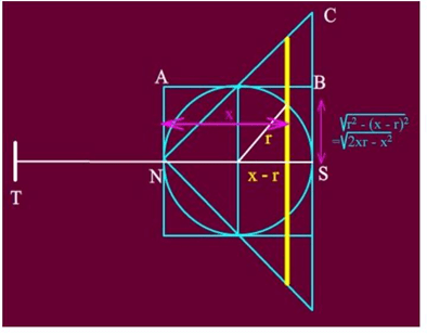 Gọi r là bán kính hình cầu. Đặt hình cầu với đường kính nằm ngang theo trục hòanh, với cực bắc N nằm ở gốc. Dựng hình trụ và hình nón bằng cách quay hình chữ nhật NABS kích thước 2r x r và tam giác NCS vuông cân quanh trục hòanh. Bây giờ cắt ra từ ba khối những lát mỏng thẳng đứng cách N một khỏang x và có độ dày là Δx. Thể tích của các miếng này xấp xỉ bằng: