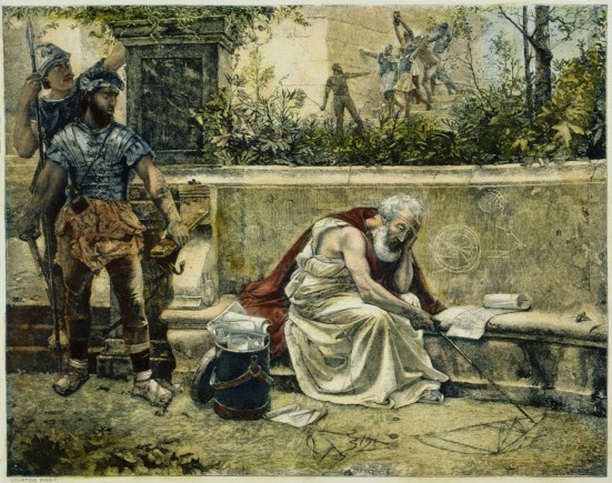 Archimedes đã tìm ra nhiều định lí hình học bằng những hình vẽ trên lớp tro của lò sưởi hoặc trên lớp dầu mỏng dùng để bôi sau khi tắm. Thực tế, theo các sử gia La Mã ông đã ra đi khi đang mải mê làm toán với hình vẽ trên sa bàn, trong khi quân xâm lược đã chọc thủng hàng phòng vệ của thành Syracuse. Khi thấy bóng một tên lính La Mã xông vào, che mất hình vẽ của mình, ông đã la lớn, bảo hắn tránh ra và nhận một ngọn giáo kết liễu đời mình.