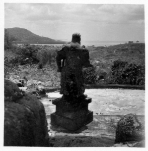 Một trong hai bức tượng tướng quân đứng hai bên ngôi mả của Mạc Cửu, hình chụp từ sau lưng tượng, nhìn về phía cửa sông Giang Thành ra biển. Hình do một người lính Hải Quân Pháp tên Roland Drosson đóng quân tại Hà Tiên chụp vào năm 1953. (đây là hình bức tượng gốc nguyên bản từ lúc lập mả)