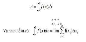 Nói một cách phóng khoáng, diện tích A là tổng của vô hạn hình chữ nhật vô cùng mỏng. Với kí hiệu tích phân do Leibniz sáng tạo, diện tích A trở thành một kí hiệu rất quen thuộc với chúng ta: