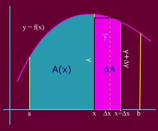 Cho x tăng lên một giá trị ∆x, thế thì A(x) tăng lên một giá trị ∆A (miền màu hồng). Dễ thấy rằng diện tích này nằm giữa diện tích hai hình chữ nhật có cùng chiều rộng là ∆x và có chiều cao lần lượt là miny và maxy trong đó miny, maxy lần lượt là giá trị nhỏ nhất và lớn nhất của hàm số f(x) trên đoạn [x , x + ∆x]. Do đó tồn tại một giá trị y* trung gian giữa miny và maxy sao cho: