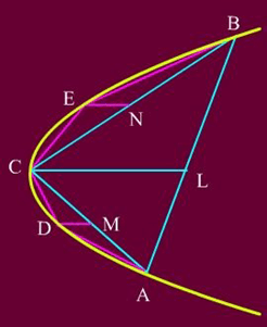 Gọi AB là một dây cung parabol trong hình bên. Từ các trung điểm L, M, N của AB, AC và BC, kẻ các đường song song với trục của parabol, chúng cắt cung parabol tại C, D và E. Từ định nghĩa hình học của parabol, Archimedes chứng tỏ rằng