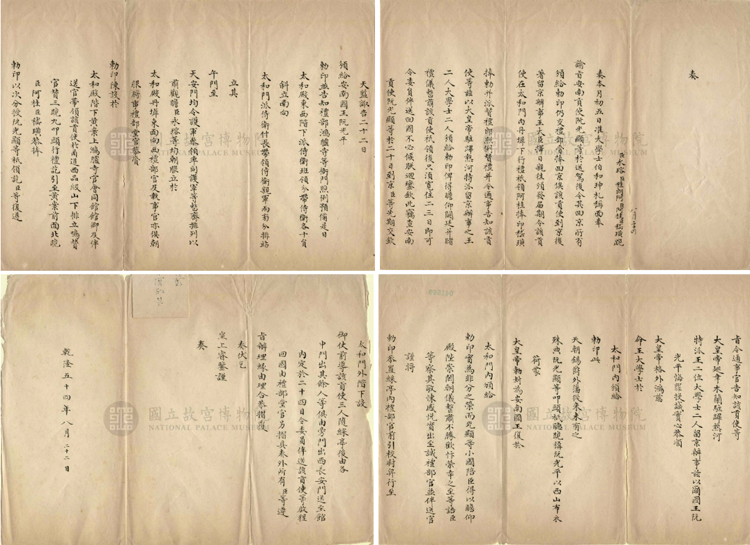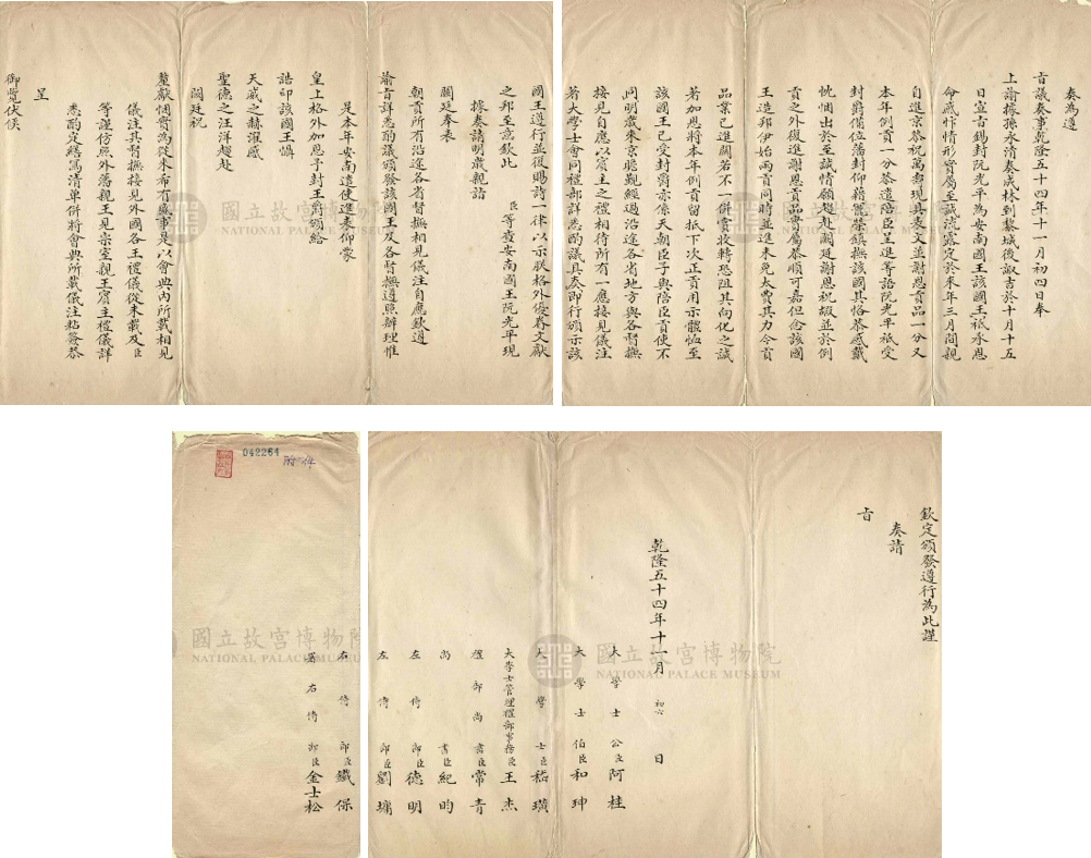 [33] Quân Cơ Xứ đáng tấu kiện, Tấu thư của Vĩnh Dung về lễ ban sắc ấn. Càn Long 54, tháng Tám, ngày 22. Số hiệu 041864. Quốc Lập Cố Cung Bác Vận Viện (Đài Bắc). Thanh Đại đáng án hệ thống.