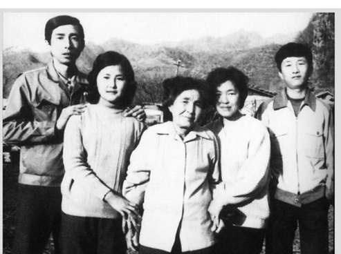 Tác giả (bên phải), tuổi 19, một năm sau khi được phóng thích từ trại khổ sai Yodok với (từ trái sang phải) chú ba, em gái Mi-ho, bà nội, và thiếm ba.