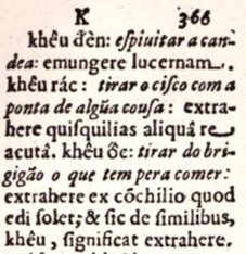 Điều này dẫn đến động từ khêu và các dạng liên hệ, phần sau (mục 3) sẽ bàn thêm về một dạng âm cổ phục nguyên của khiêu, khêu, trêu và *lêu so với dạng HV thiêu/khiêu 挑. Tuy nhiên, VBL cũng ghi động từ tlêu (~ trêu) cùng nét nghĩa với lêu, nhưng cũng cho thấy cách dùng rộng hơn như trêu tôi, trêu đàn bà, đi trêu đứa ấy – so với cách dùng hẹp hơn của lêu trong lêu trâu húc nhau. Một điều đáng chú ý là trong vốn từ Hán có chữ liêu 撩 cùng nét nghĩa (nâng lên, khiêu chọc) và cận âm lêu, và cũng dùng làm chữ Nôm để viết lêu: các tác giả ghi dạng này là Béhaine 1772/1773, Taberd 1838, Huỳnh Tịnh Của/1895 – so với chữ Nôm dùng khâu HV 丘 (Chỉ Nam Ngọc Âm Giải Nghĩa, Quốc Âm Thi Tập) … VBL trang 268 còn ghi động từ ghẹo (hàm ý đùa giỡn với đàn bà): các dạng lêu, trêu và ghẹo có liên hệ nào hay không? Phần sau sẽ bàn thêm chi tiết.