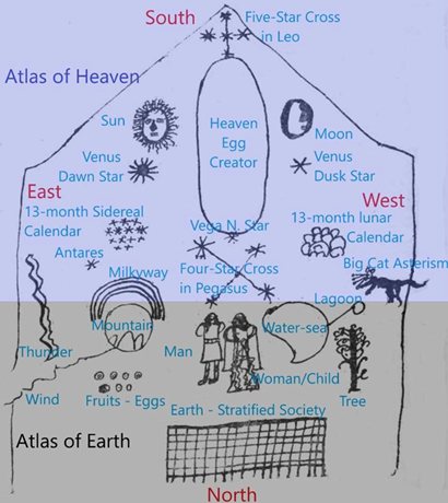 Atlas of Heaven, phần trên của Atlas Peru trong Hình Một, chứa một bầu trời nguyên thủy bản đồ năm 12.000 trước Công nguyên, hai cuốn lịch cùng tuổi, biểu tượng sáng tạo hình bầu dục của thiên đường, v.v.