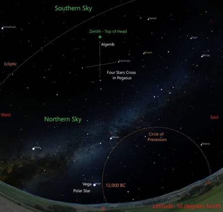 Hình Hai: 12.000 TCN bầu trời đêm ở vĩ độ 10 ôi N trong khi hướng về phía Bắc. Vega, Ngôi sao Bắc Cực, xuất hiện 10 ôi phía trên đường chân trời. Bốn- Ngôi sao Thập tự trong Pegasus đã ở trong Bầu trời phía Bắc. Đỉnh của Đầu được đánh dấu là Đỉnh cao.