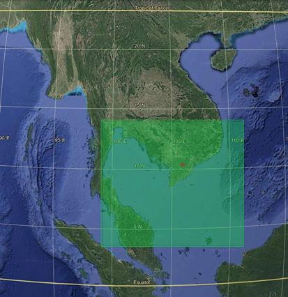 Hình Ba: Bản đồ Google của Đông Nam Á ngày nay trong Bán cầu Bắc: Khu vực này là được giới hạn bởi hai vĩ độ song song 3 và 14 độ Bắc. Ngôi sao đỏ ở 11 ôi 23′ 53” Bắc 106 ôi 10’16” E là “Bà Đen” hay “Bà Mẹ Đen” Núi ở đồng bằng sông Cửu Long