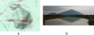 Hình Năm: A. Địa hình Google của Núi Bà Đen “Mama Đen” có ba đỉnh (11độ23’53” Bắc, 106 độ10’16” Đông); B. Cảnh phía Đông của Bà Đen “Mẹ Đen” Núi. Đỉnh Pheonix cao 419 mét, Đỉnh Bà Đen “Mama Đen” ở độ cao 986 mét, và đỉnh Pig Peak cao 341 mét.