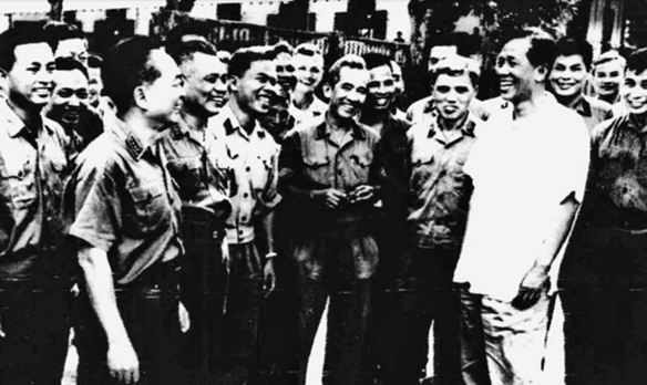 Lê Duẩn (áo sơ mi trắng), Tổng bí thư Đảng Cộng sản Việt Nam, tại một hội nghị quân sự vào tháng 7 năm 1971. Cùng với ông là các tướng Võ Nguyên Giáp và Văn Tiến Dũng (thứ hai và thứ ba từ bên trái). (Douglas Pike Photo Collection, The Vietnam Archive, Texas Tech University)