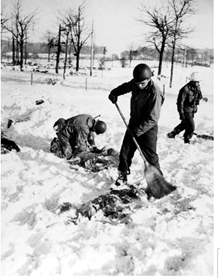 Cuộc thảm sát tàn bạo nhất của quân Peiper là ở Malmédy, Bỉ. Hinh trên, binh sĩ Mỹ bới tìm thi thể nạn nhân ra khỏi tuyết.