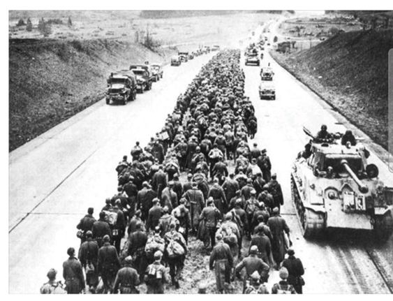 Quân đội Mỹ tiến quân đi qua đoàn tù binh Đức (ở giữa) bị bắt gần Giessen, Đức, năm 1945.