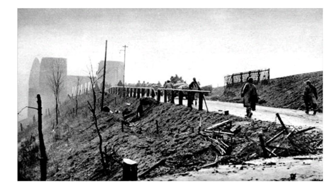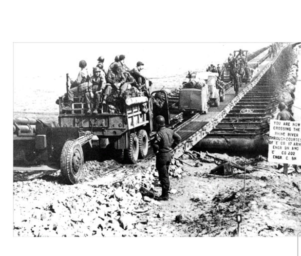 Quân đội của Sư đoàn Thiết giáp số 9 của Hoa Kỳ tiến về Cầu Ludendorff tại Remagen, Đức. Họ là một trong những người lính đầu tiên vượt sông Rhine.