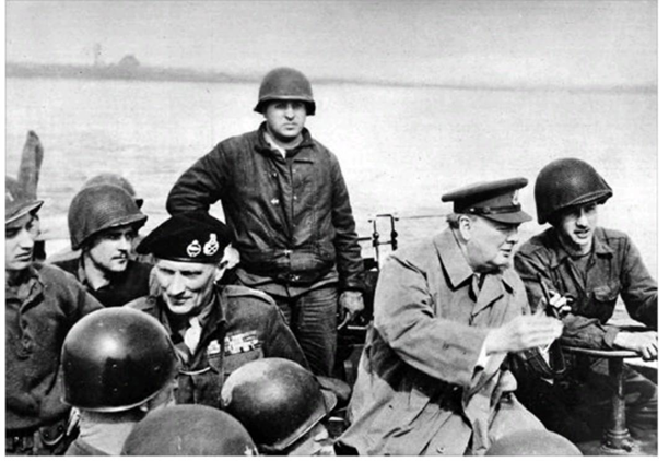 Vào ngày 31 tháng 3 năm 1945, Thống chế Bernard Montgomery đội mũ nồi và Thủ tướng Winston Churchill (thứ hai từ bên phải) băng qua sông Rhine cùng quân đội Hoa Kỳ để quan sát quân Đồng minh tiến vào Đức.