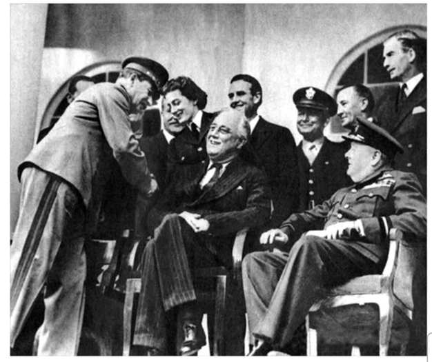 Tại Hội nghị Yalta, vào tháng 2 năm 1945, các đồng minh (hàng ghế đầu, từ trái sang phải): Joseph Stalin, Franklin Roosevelt và Winston Churchill, họp để thảo luận về việc quản trị các quốc gia Trục sau khi thế chiến kết thúc.